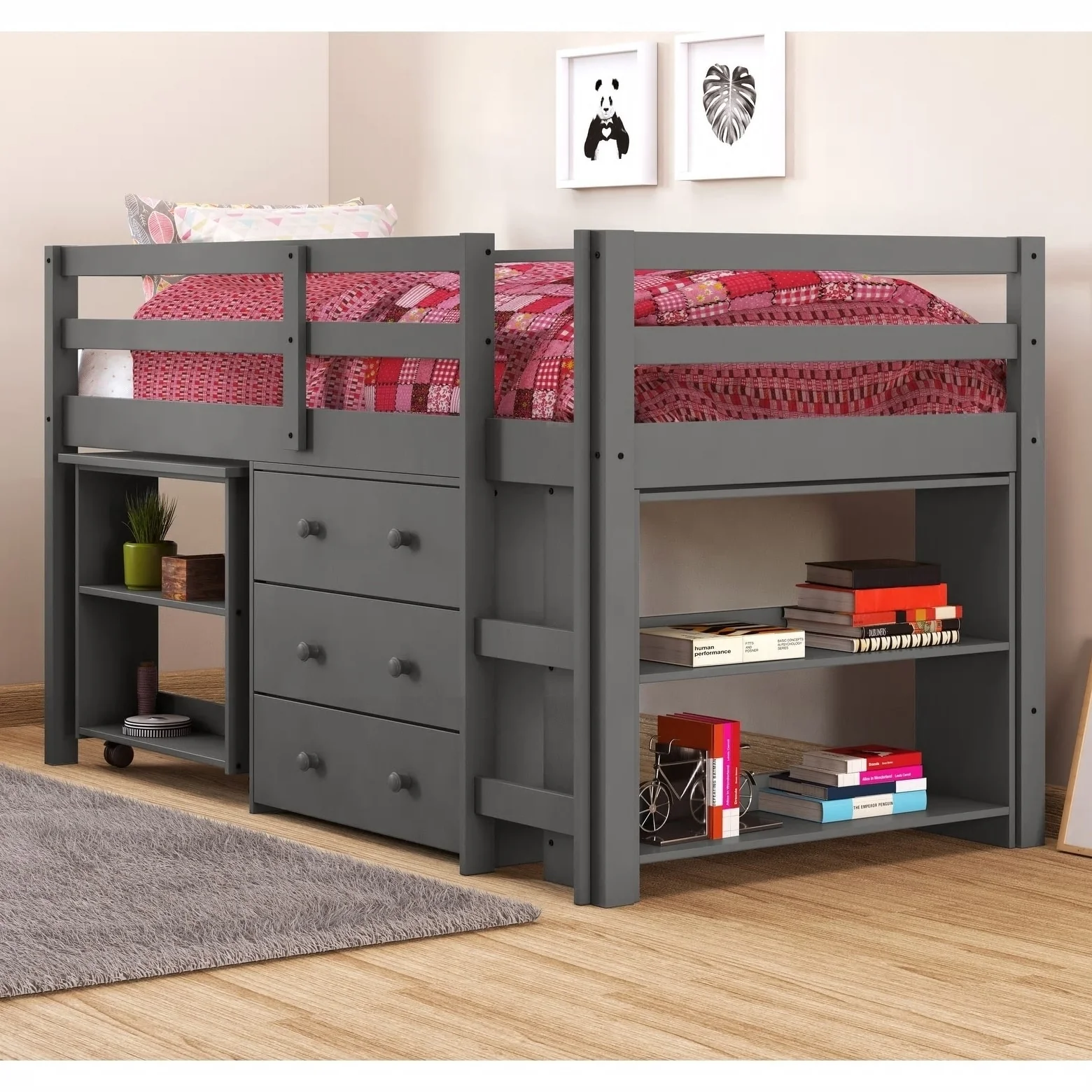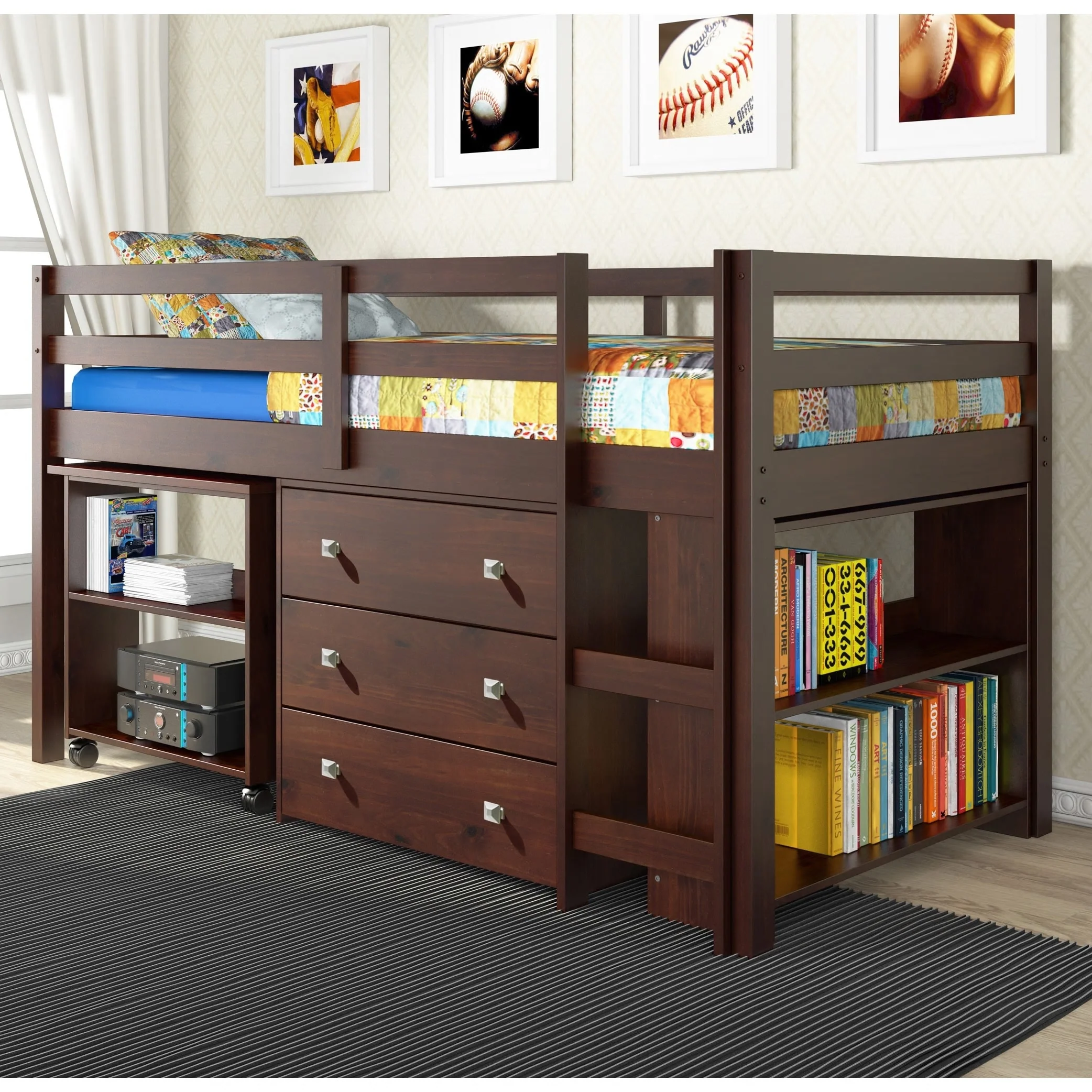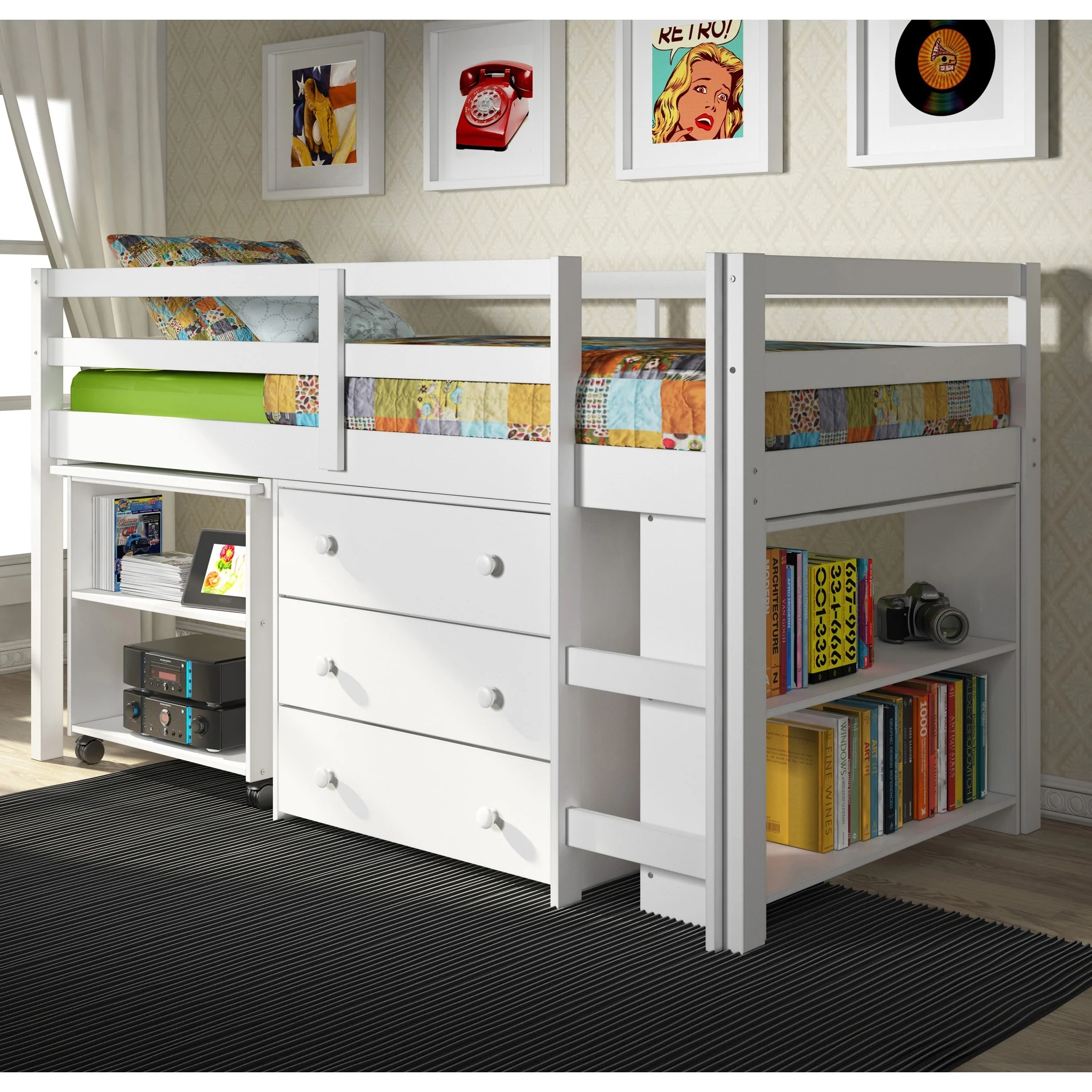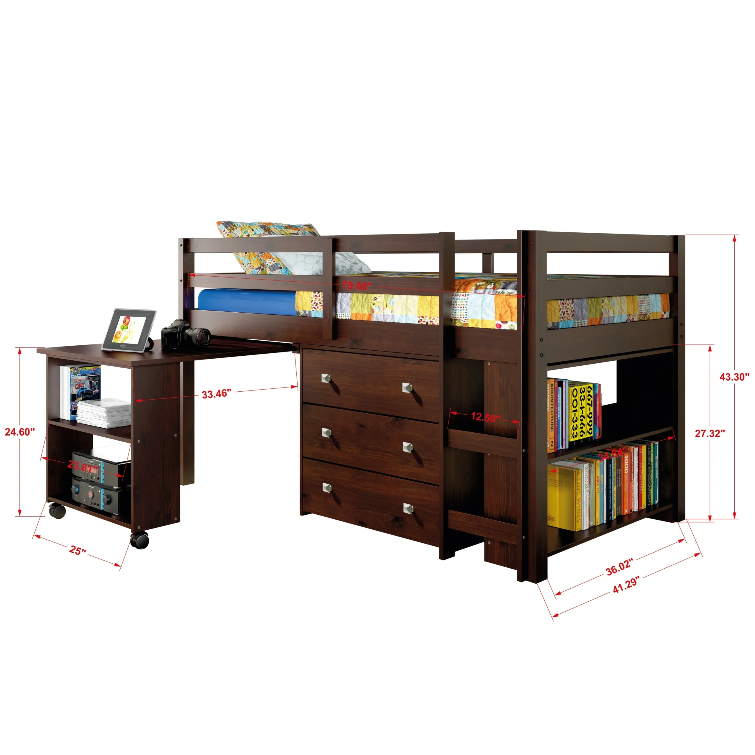 - Includes Twin-size loft bed, desk, chest, and bookcase
